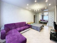 Напольное покрытие во всей квартире - ламинат. Потолки натяжные. На кухне обои под покраску (можно без проблем перекрасить, по своему желанию), а в остальных помещениях обычные качественные обои с интересной фактурой.