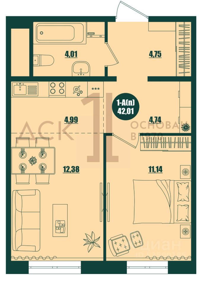 Общая площадь42,01 м²