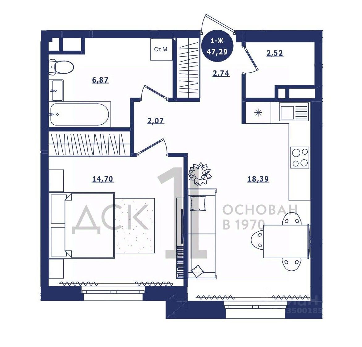 Продаётся 1-комнатная квартира в сданном доме (Дом 3 корпус 1,2), срок сдачи: IV-кв. 2023, общей площадью 47.29 кв.м., на 8 этаже. Новый жилой комплекс "Крылов" от застройщика "ДСК-1" расположен по адресу: г. Сургут, улица Крылова.