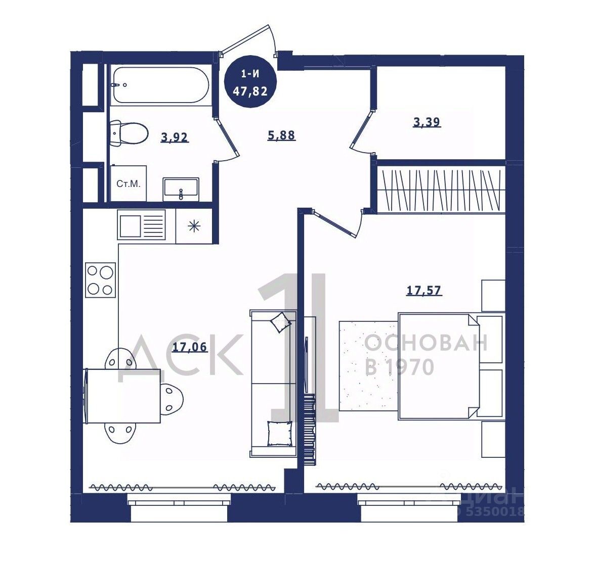 Продаётся 1-комнатная квартира в сданном доме (Дом 3 корпус 1,2), срок сдачи: IV-кв. 2023, общей площадью 47.82 кв.м., на 9 этаже. Новый жилой комплекс "Крылов" от застройщика "ДСК-1" расположен по адресу: г. Сургут, улица Крылова.
