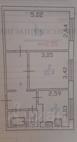 Комнаты 13,3 кв.м. и 10,4 кв.м., коридор 10,6 кв.м. кухня 7,2 кв.м.