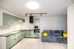 Кухня гостиная в светлых тонах, с встроенной кухней фисташкового цвета. Встроенная техника в полном составе, посудомоечная машинка новая. Кухня гостиная объединена с зоной лоджии, пол с подогревом, видовое решение .