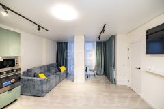 Квартира имеет ремонт по дизайн проекту, выполненный из современных дорогостоящих материалов. На полу кварц винил, на стенах обои, натяжные потолки с точечными светильниками и контрастными треками. Световое решение в разных сценариях.