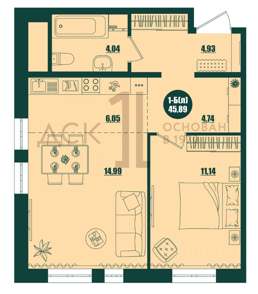 Продаётся 1-комнатная квартира в строящемся доме (Дом 4.3), срок сдачи: II-кв. 2026, общей площадью 45.89 кв.м., на 14 этаже. Новый жилой комплекс "Крылов" от застройщика "ДСК-1" расположен по адресу: г. Сургут, улица Крылова.