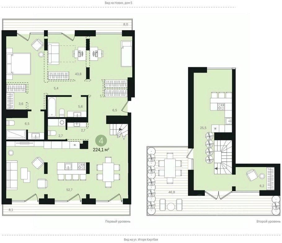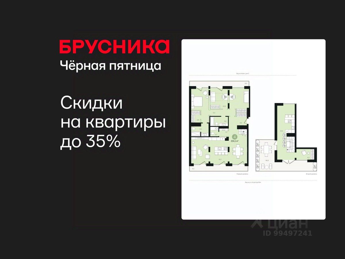 Двухуровневая квартира с кухней-гостиной и четырьмя спальнями в квартале "Новин". Особенности планировки: окна на две стороны, второй санузел, окна в пол, двухуровневая, вид во двор, свободная планировка, балкон, терраса на крыше.