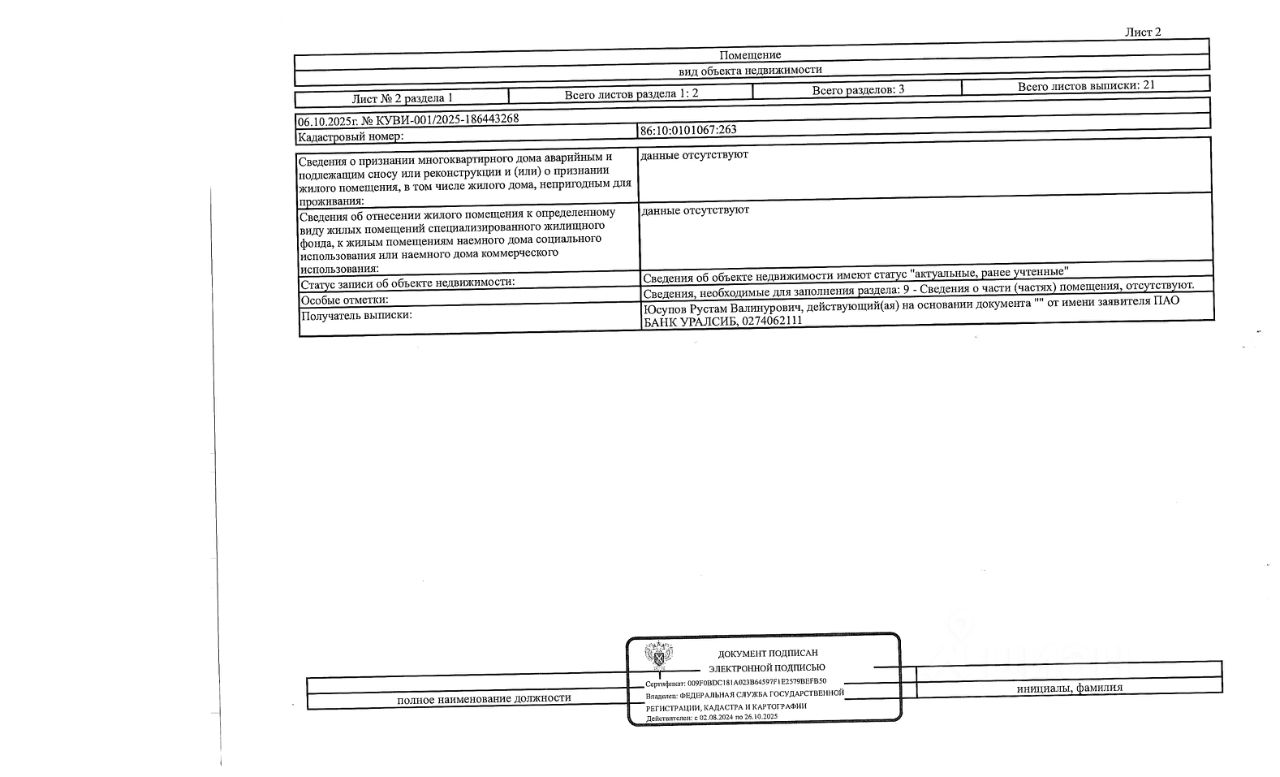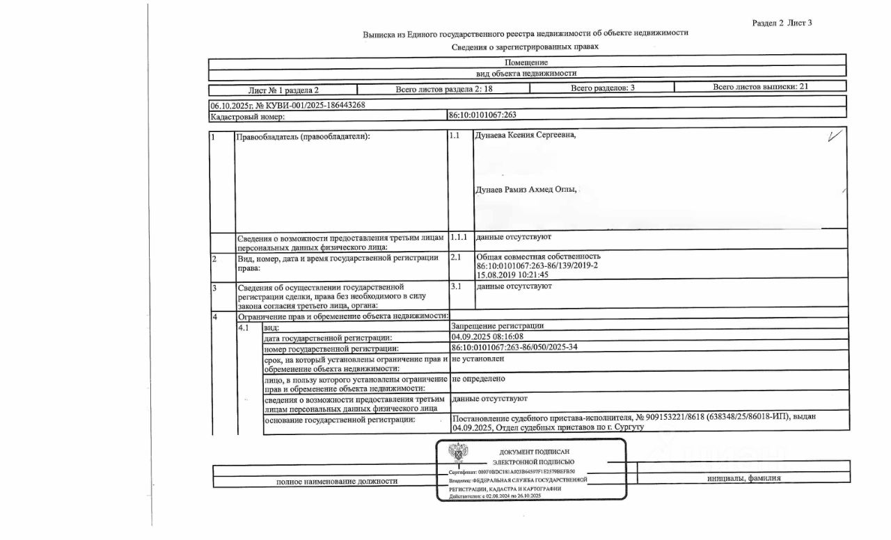 Должник: Дунаева К.С., собственник: Дунаева К.С., Дунаев Р.А.о. Лот: Жилое помещение (квартира), площадь 54 кв.м., кадастровый номер: 86:10:0101067:263, г. Сургут, проезд Первопроходцев, д.13, кв. 66 (информация о зарегистрированных лицах отсутствуют, задолженность за капитальный ремонт на 12.09.2025 - 77 т.р.), н/ц: 5436800 р., з-к: 5436 р., код: 0014, рег. 25-500;