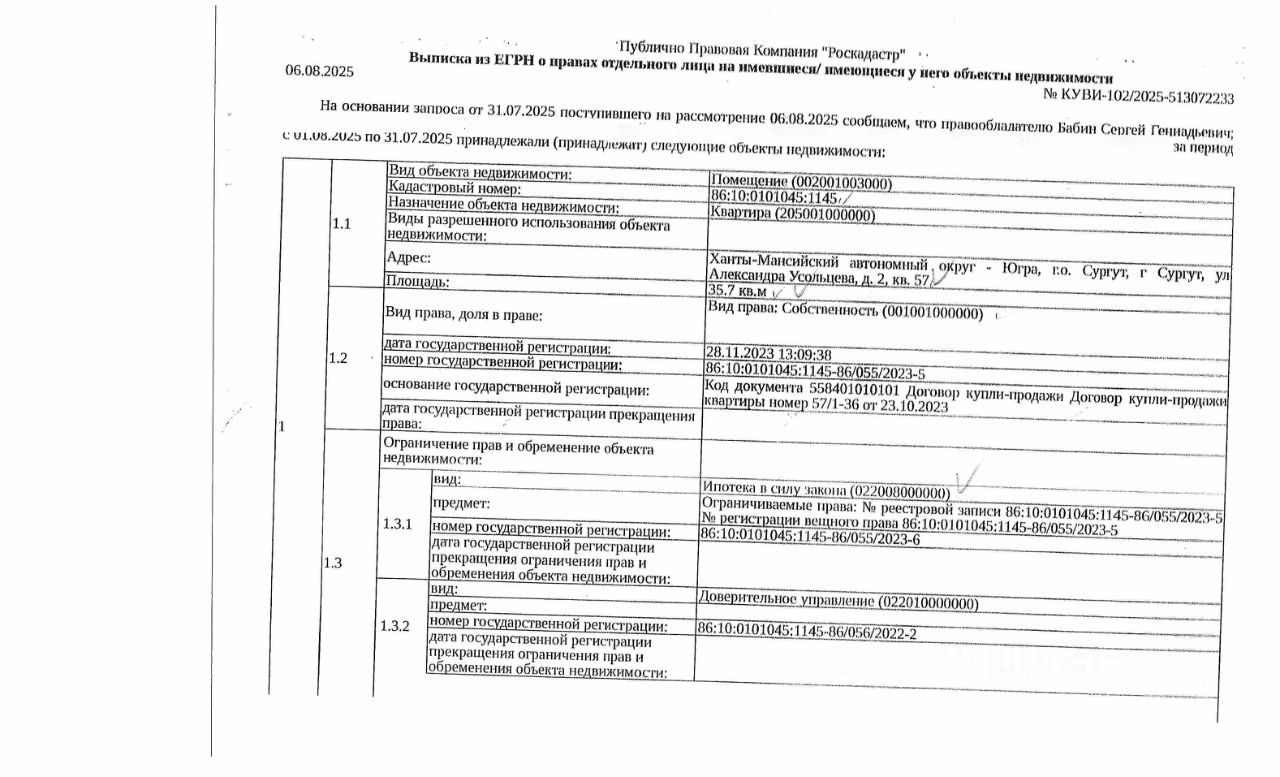 Должник: Бабин С.Г., собственник: Бабин С.Г. Лот: Жилое помещение (квартира), площадь 35,7 кв.м., кадастровый номер: 86:10:0101045:1145, г. Сургут, ул. Александра Усольцева, д.2, кв.57, (зарегистрированных лиц на 20.08.2025 нет, информация о задолженности за капитальный ремонт отсутствует), н/ц: 2999480 р., з-к: 2999 р., код: 0014, рег. 25-413;