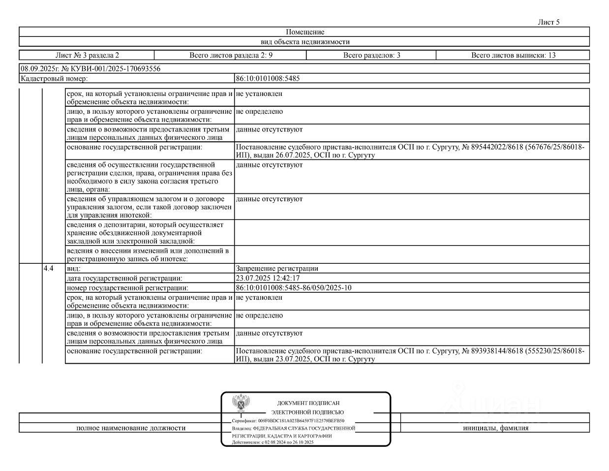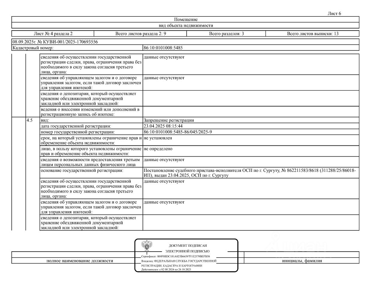 Должник: Птицына Е.Л., собственник: Птицына Е.Л. Лот: Жилое помещение (квартира), площадь 63,1 кв.м., кадастровый номер: 86:10:0101008:5485, г. Сургут, пр-кт Мира, д.30, кв.18, (зарегистрировано 2 взрослых, задолженность за капитальный ремонт на 19.08.2025 22 т.р.), н/ц: 4349069,20 р., з-к: 4349 р., код: 0014, рег. 25-412;