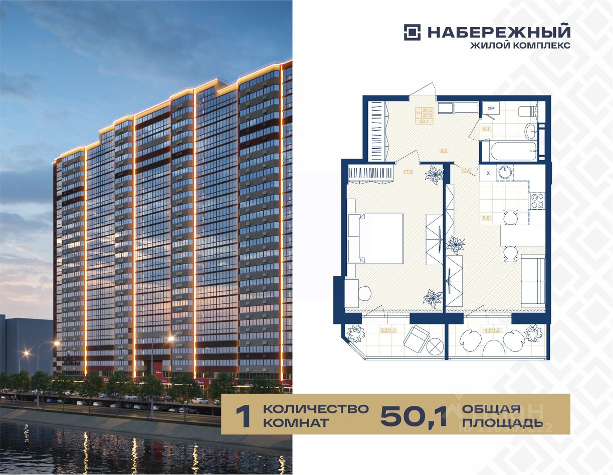 Продается уютная однокомнатная видовая квартира 289 площадью 50,1 кв.м. с большой лоджией и просторной кухней-гостиной площадью 18 кв.м., в жилом комплексе "Набережный". Общая площадь квартиры — 50,1 кв.м., жилая — 30,5 кв.м. Это идеальное место для комфортной жизни вашей семьи!