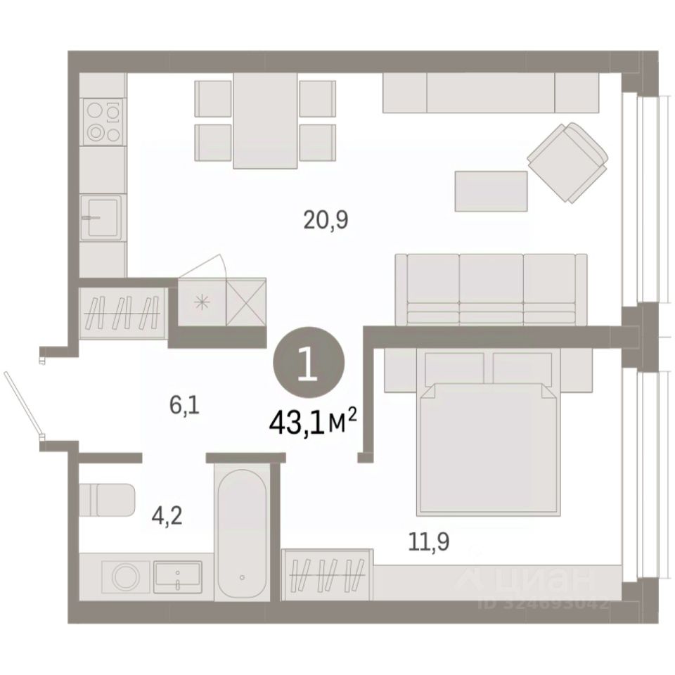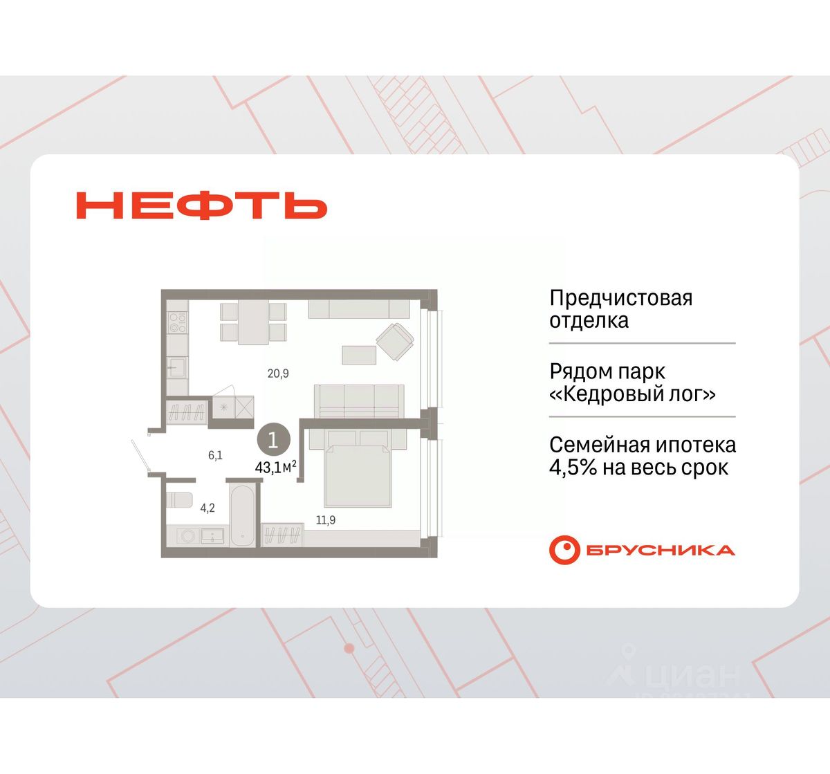 1-комн. квартира от застройщика с предчистовой отделкой в ЖК "Нефть" на 2 этаже. Общая площадь: 43.08 кв.м., жилая: 11.9 кв.м., площадь просторной кухни-гостиной: 20.9 кв.м. Все окна выходят на одну сторону. В квартире один совмещенный санузел. Высота потолков 2.7 м.