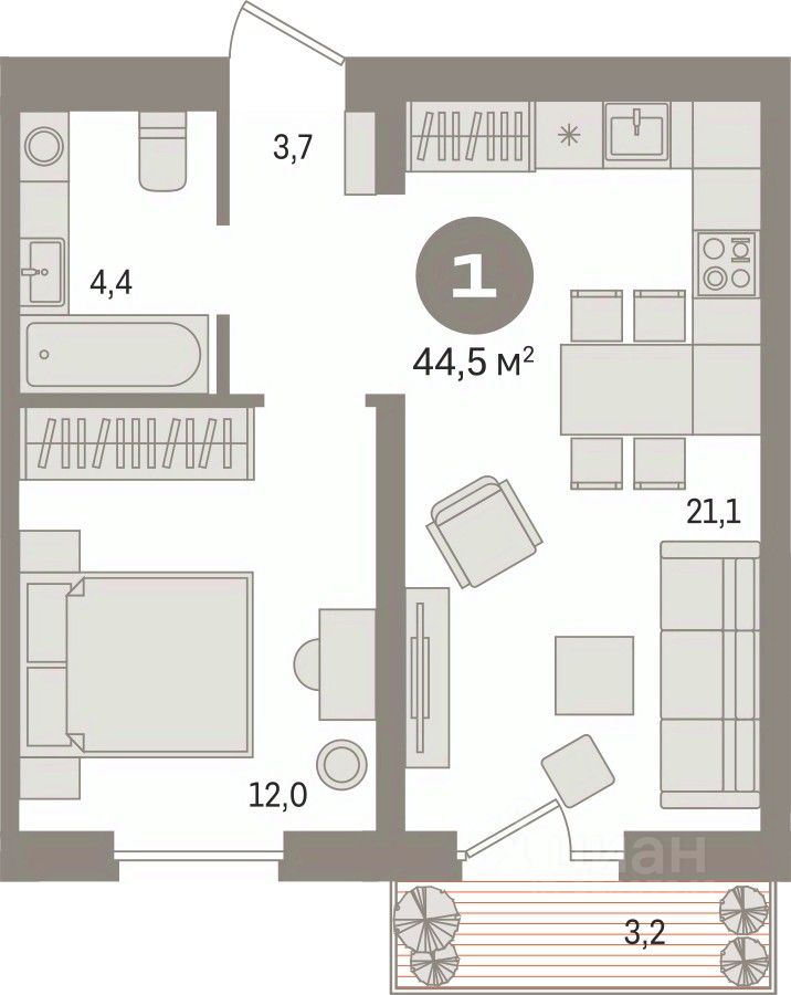 Продается 1-комн. квартира с предчистовой отделкой в ЖК "Новин" на 3 этаже. Общая площадь: 44.47 кв.м., жилая: 12 кв.м., площадь просторной кухни-гостиной: 21.1 кв.м. Все окна выходят на одну сторону. В квартире один балкон, один совмещенный санузел. Высота потолков 2.7 м.