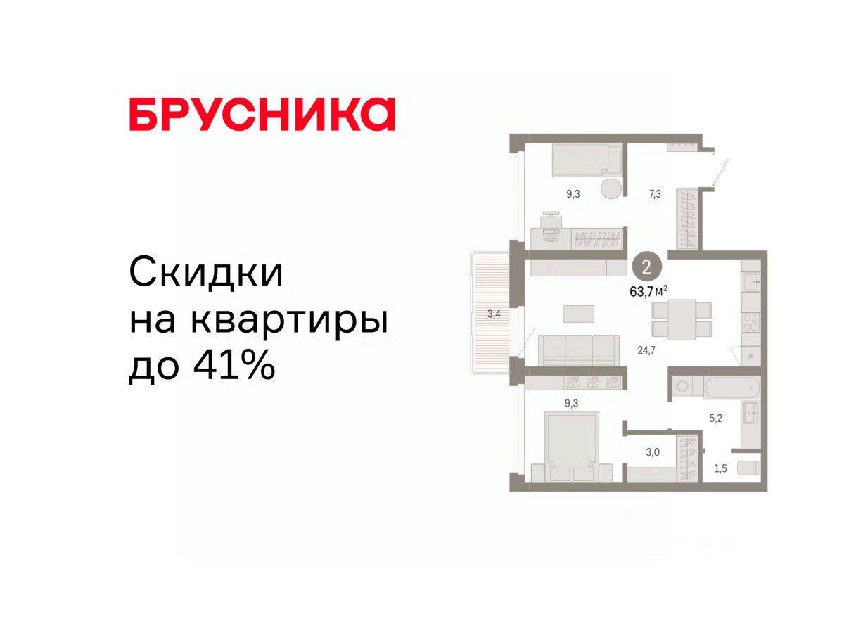 Квартира с кухней-гостиной и двумя спальнями в квартале "Нефть". Особенности планировки: предчистовая отделка.