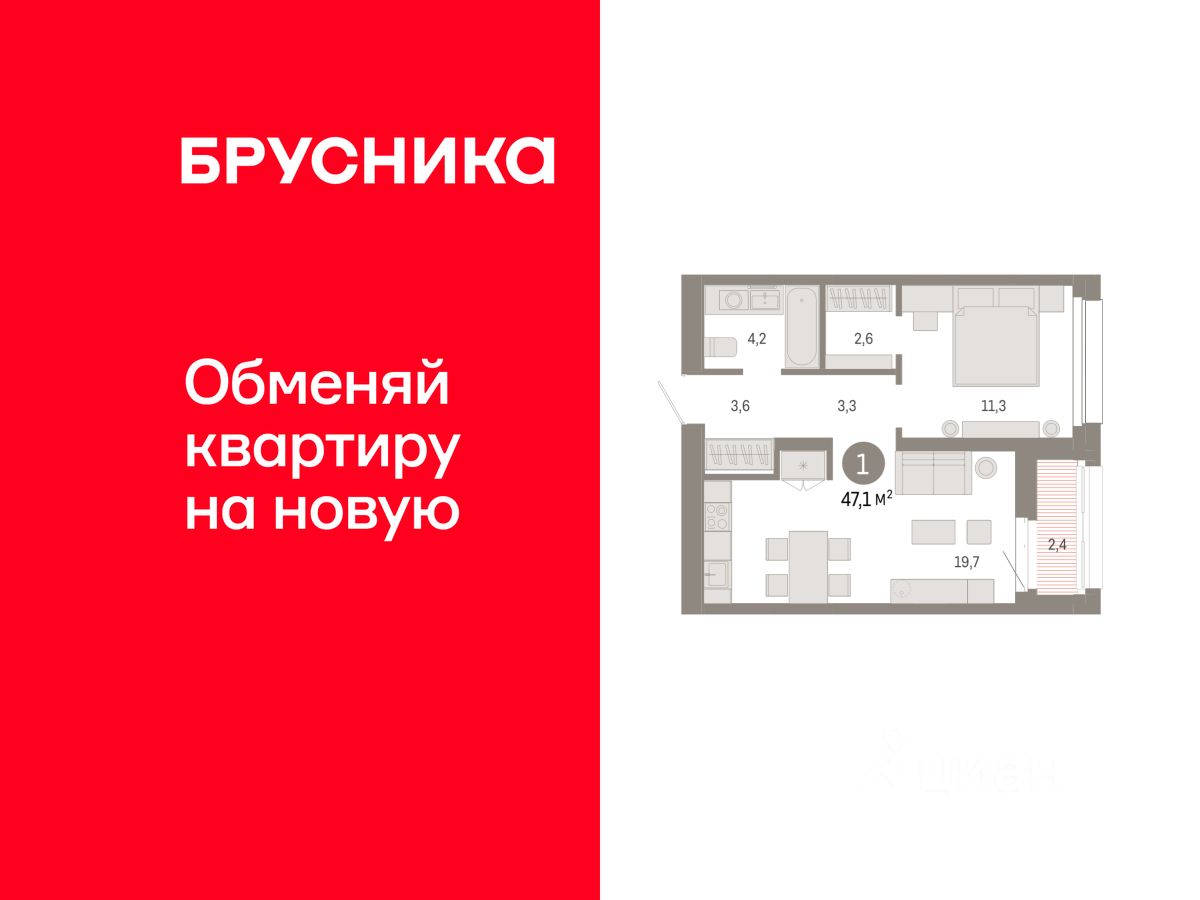 Квартира с кухней-гостиной и одной спальней в квартале "Нефть". Особенности планировки: гардеробная, лоджия, предчистовая отделка.