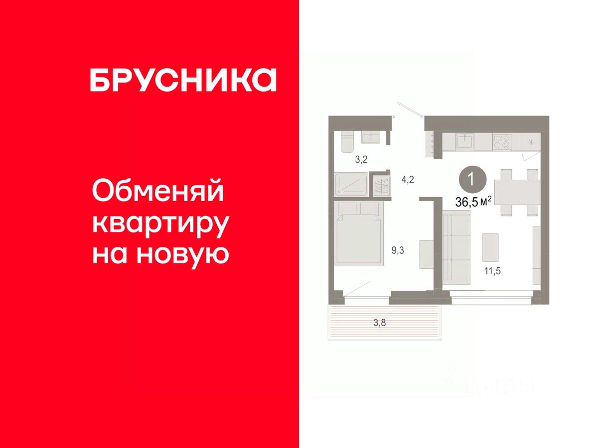 Квартира с кухней-гостиной и одной спальней в квартале "Нефть". Особенности планировки: балкон, вид во двор, предчистовая отделка.