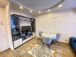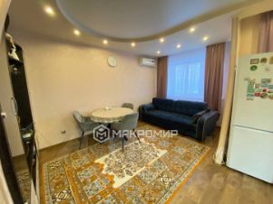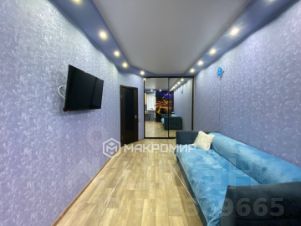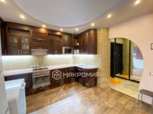 В квартире хороший ремонт: на полу линолеум, в коридоре и санузле плитка, обои на стенах, потолки навесные с точечным освещением, фартук у кухонного гарнитура выложен мозаикой.