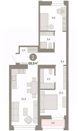 Квартира с кухней-гостиной и двумя спальнями в квартале "Нефть". Особенности планировки: окна на две стороны, предчистовая отделка, разнесённые спальни.