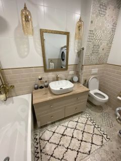 Выполнен современный дизайнерский ремонт, который отлично сохранил свою актуальность и красоту. Полы покрыты ламинатом высокого класса - в один уровень, стены - декоративная штукатурка, натяжные потолки.