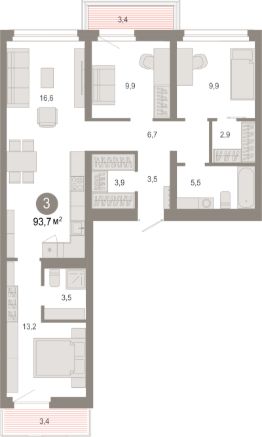 Продаётся 3-комнатная квартира в строящемся доме (НФТ1), срок сдачи: II-кв. 2027, общей площадью 93.7 кв.м., на 7 этаже. Новый жилой комплекс "по пр. Набережный" от застройщика "Брусника" расположен по адресу: г. Сургут, Набережный проспект.