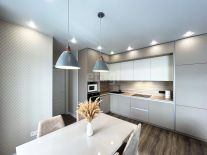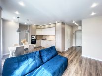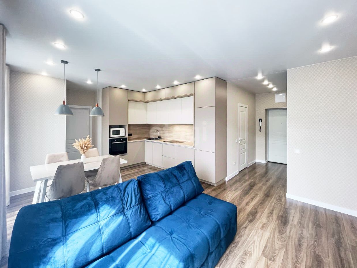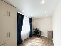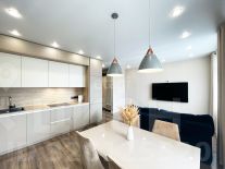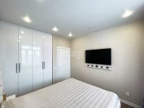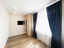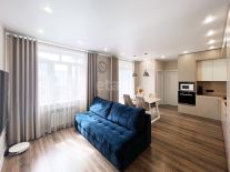 В квартире выполнен капитальный, современный и стильный ремонт, полы покрыты ламинатом(по всей квартире в один уровень), хорошие двери, натяжные потолки, санузел выложен кафелем. Квартира очень светлая и комфортная, полностью готовая к проживанию. При продаже мебель и техника остаётся.