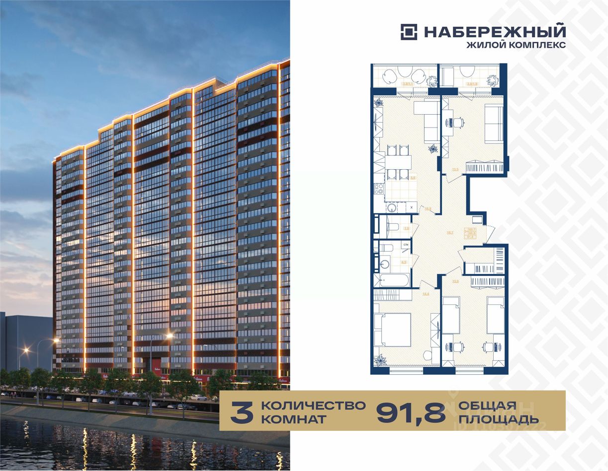 Продается уютная трехкомнатная видовая квартира 229 площадью 91,8 кв.м. с большой лоджией, гардеробной и кухней-гостиной площадью 16,9 кв.м., тремя комнатами площадью 15,9 м2, 14,4 м2, и 13,5 м2, в жилом комплексе "Набережный". Общая площадь квартиры — 91,8 кв.м., жилая — 60,7 кв.м. Это идеальное место для комфортной жизни вашей семьи!