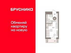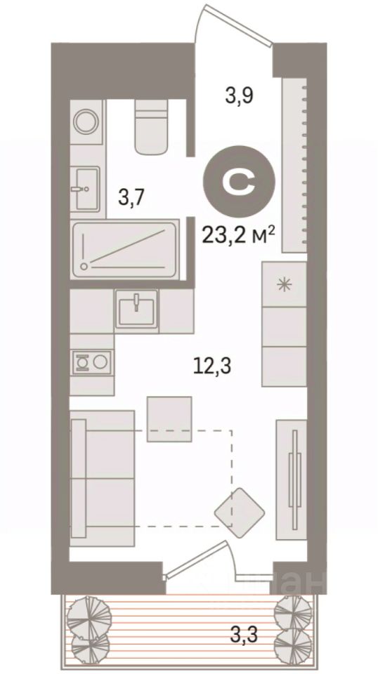 Однокомнатная студия с предчистовой отделкой в ЖК "Новин" на 4 этаже. Общая площадь: 23.16 кв.м., площадь гостиной 12.3 кв.м., из которых 5 кв.м. выделено под кухонную зону. Все окна выходят на одну сторону. В квартире один балкон, один совмещенный санузел. Высота потолков 2.7 м.