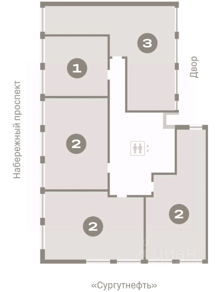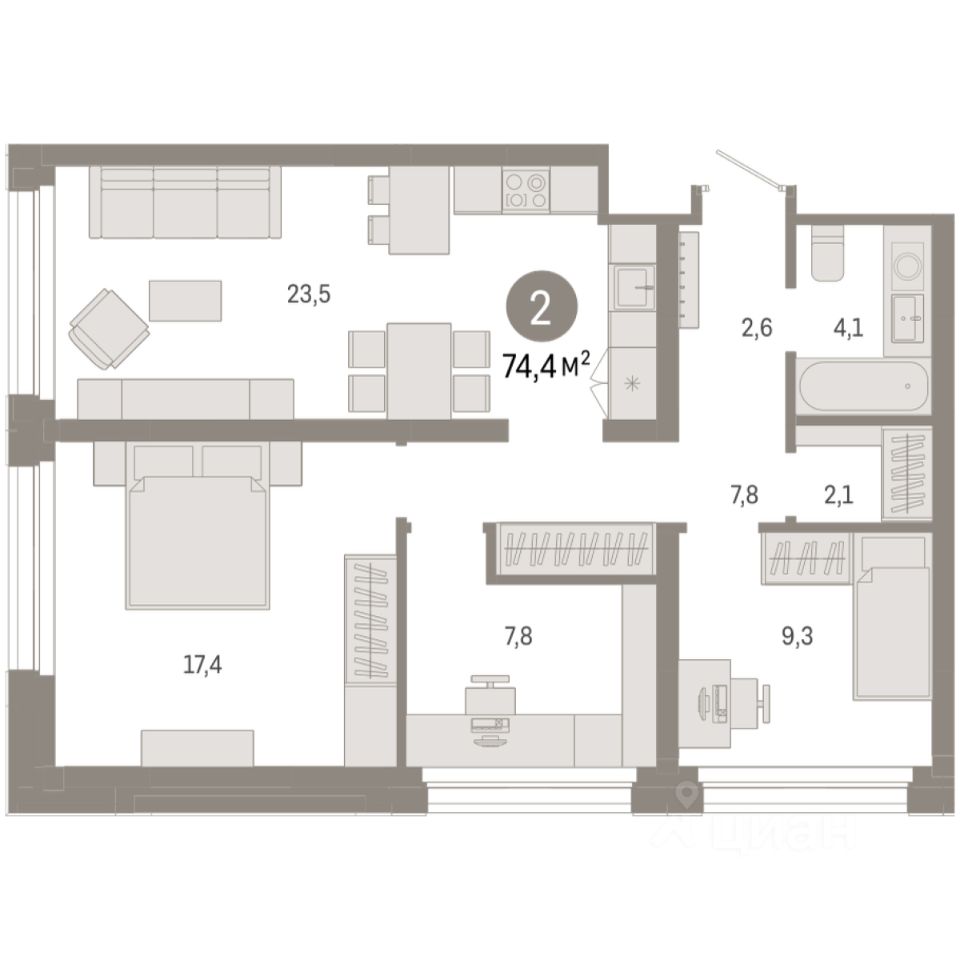 Квартира с кухней-гостиной и двумя спальнями в квартале "Нефть". Особенности планировки: предчистовая отделка, рабочий кабинет, разнесённые спальни.