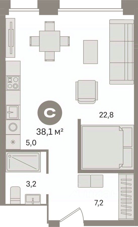 Продается однокомнатная студия с предчистовой отделкой в ЖК "Гудзон" на 5 этаже. Общая площадь: 38.14 кв.м., площадь гостиной 27.8 кв.м., из которых 5 кв.м. выделено под кухонную зону. Все окна выходят на одну сторону. В квартире один совмещенный санузел. Высота потолков 2.72 м.