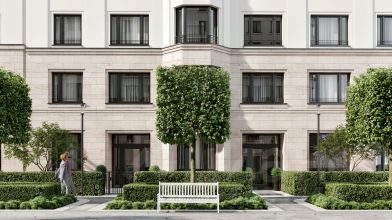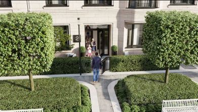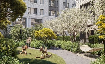 В проекте выражена идея интровертности здания: стены дома устроены вокруг внутреннего двора, который находится в центре композиции. Также здесь расположены две пешеходные арки, через которые осуществляется сквозной доступ во двор с улицы и главный вход в здание. Двор носит полуприватный характер и становится камерным лобби для жителей и гостей. Он полностью закрыт от машин. Во дворе высажены уже взрослые деревья, кустарники, цветы и злаковые травы, постелен газон. Растения размещены в грунте и дополнительно расставлены в вазонах. Во дворе предусмотрены места отдыха и прогулочные дорожки. Рядом с домом спроектирована большая детская площадка для детей разных возрастов с лестницами, горками и качелями, установлены уличные тренажёры для воркаута. #z5bUlc