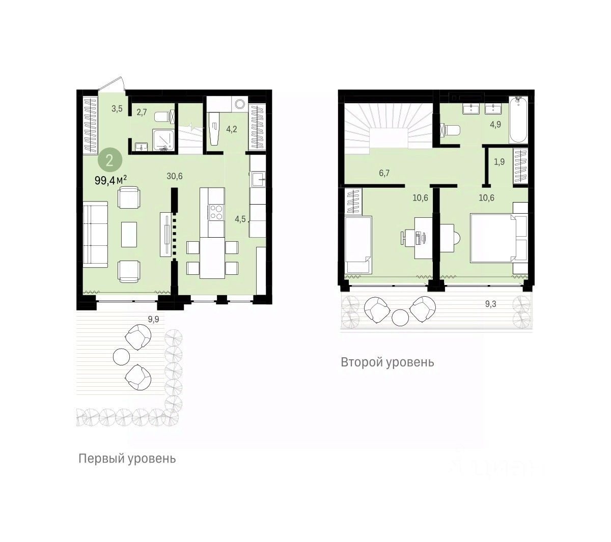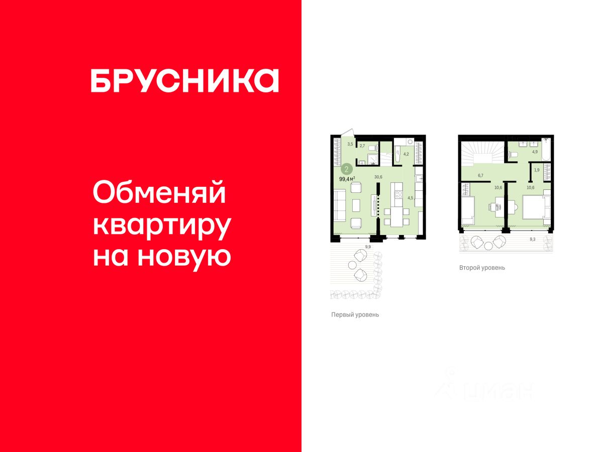 Двухуровневая квартира с кухней-гостиной и двумя спальнями в квартале "Новин". Особенности планировки: балкон, второй санузел, гардеробная, двухуровневая, постирочная, предчистовая отделка, терраса.