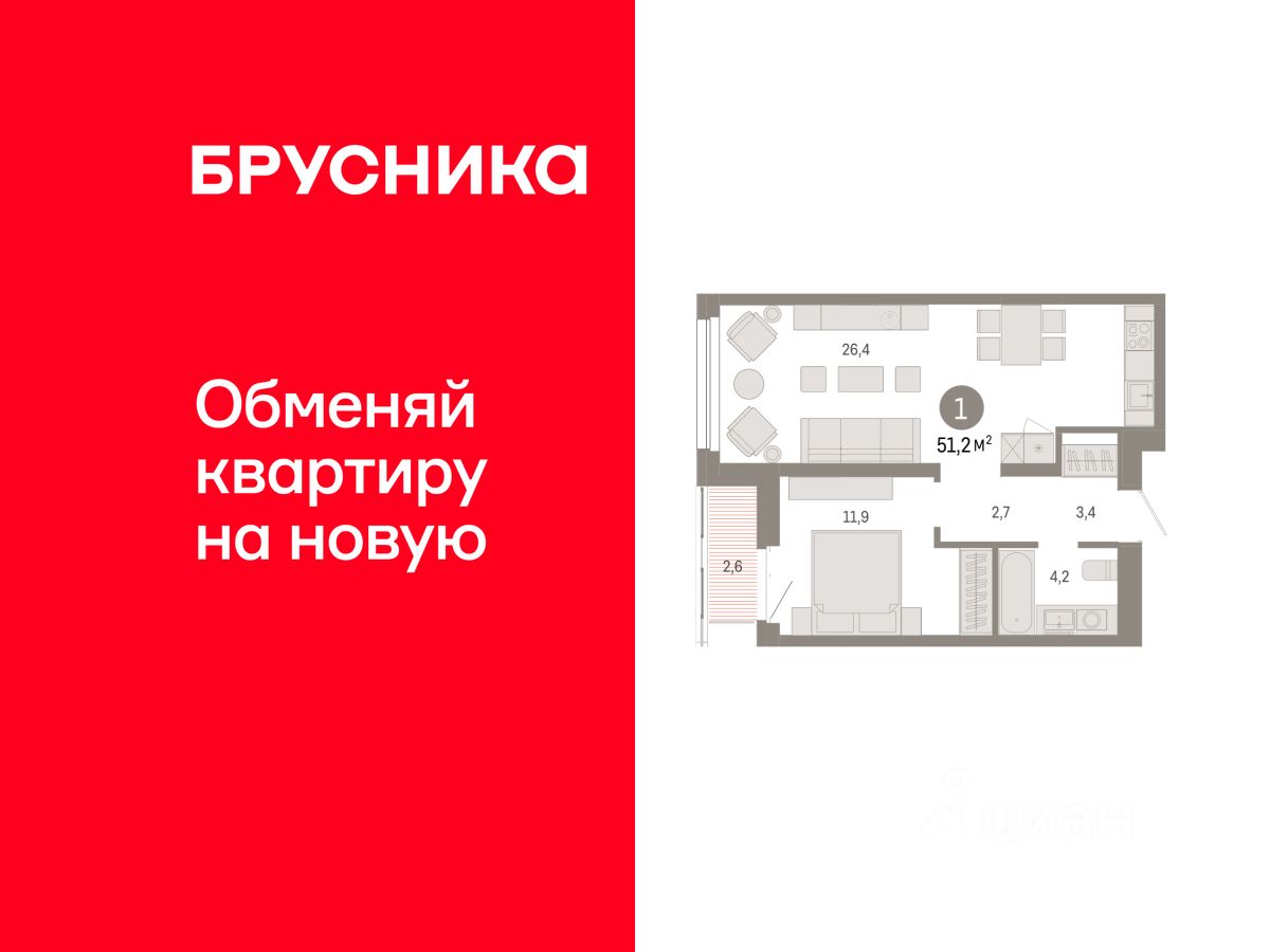 Квартира с кухней-гостиной и одной спальней в квартале "Нефть". Особенности планировки: предчистовая отделка.
