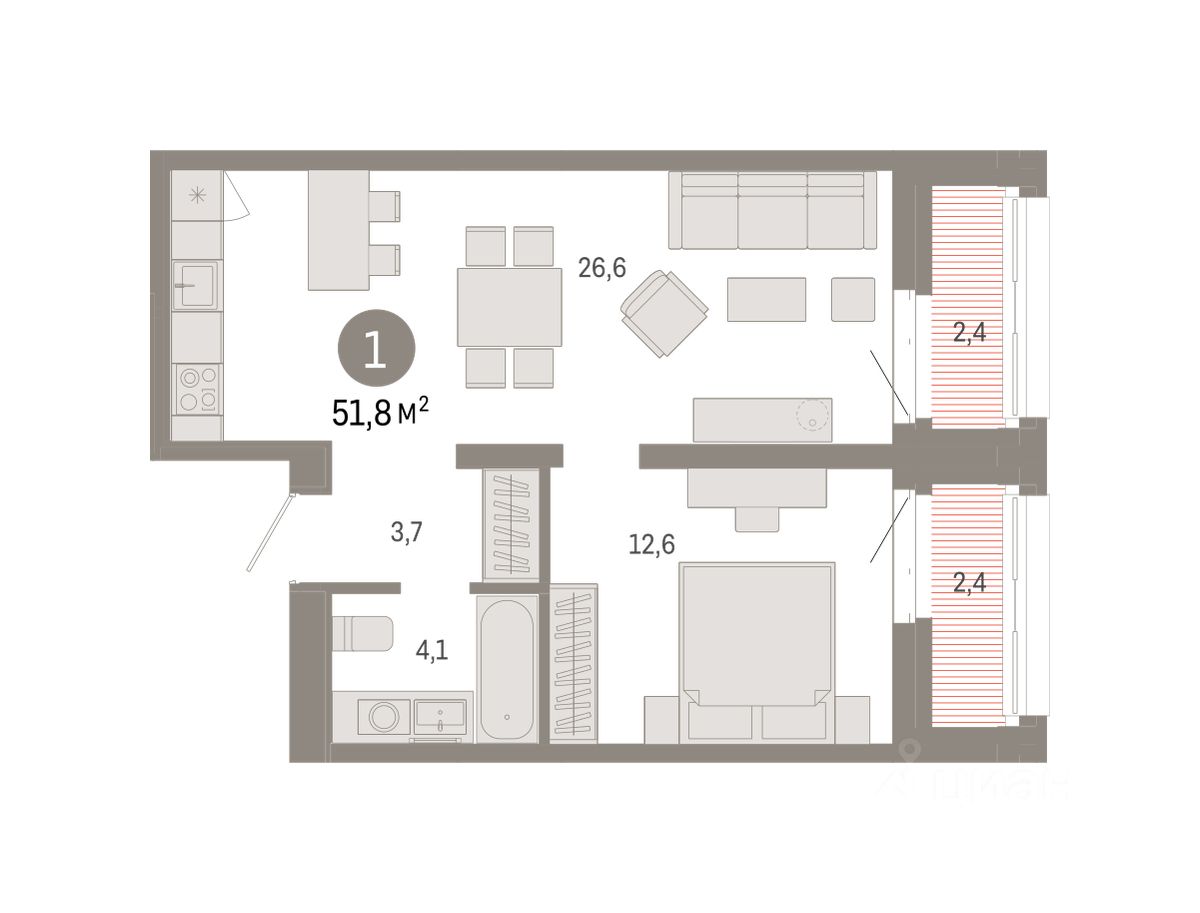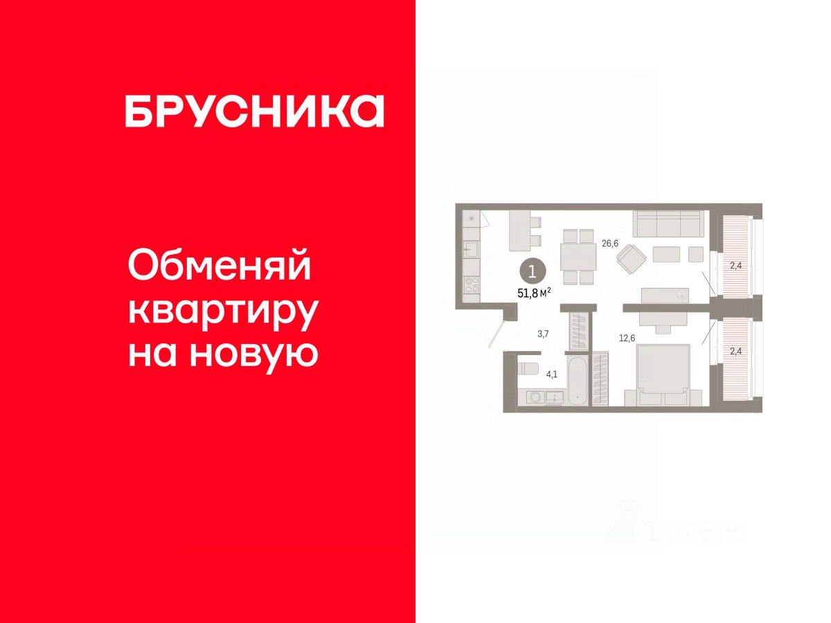 Квартира с кухней-гостиной и одной спальней в квартале "Нефть". Особенности планировки: предчистовая отделка.