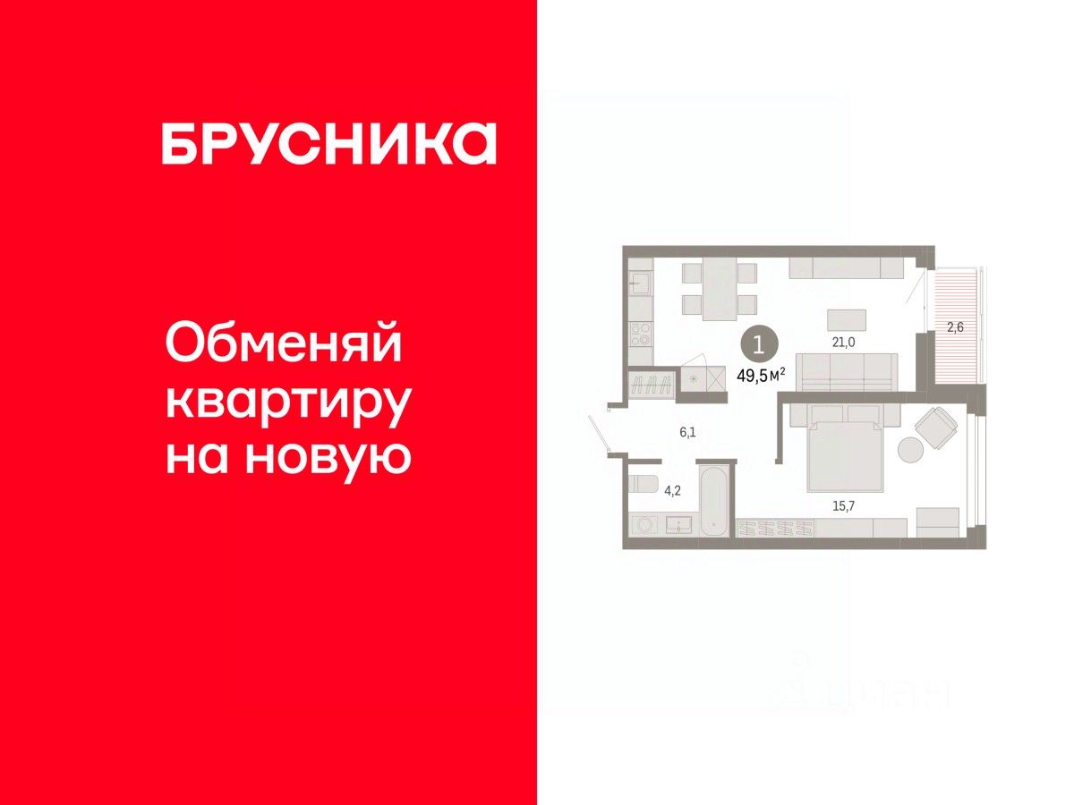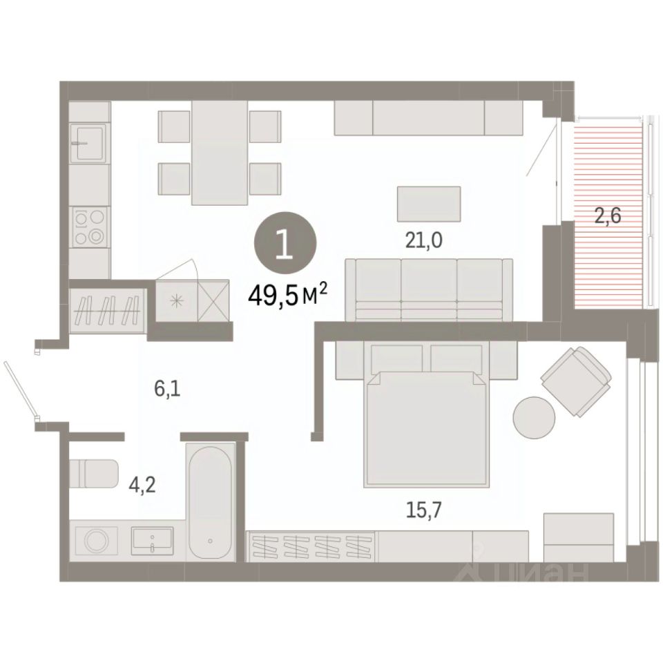 Квартира с кухней-гостиной и одной спальней в квартале "Нефть". Особенности планировки: гардеробная, лоджия, предчистовая отделка.