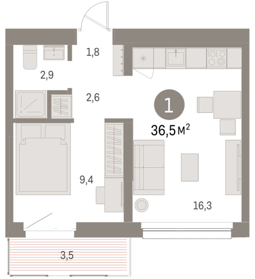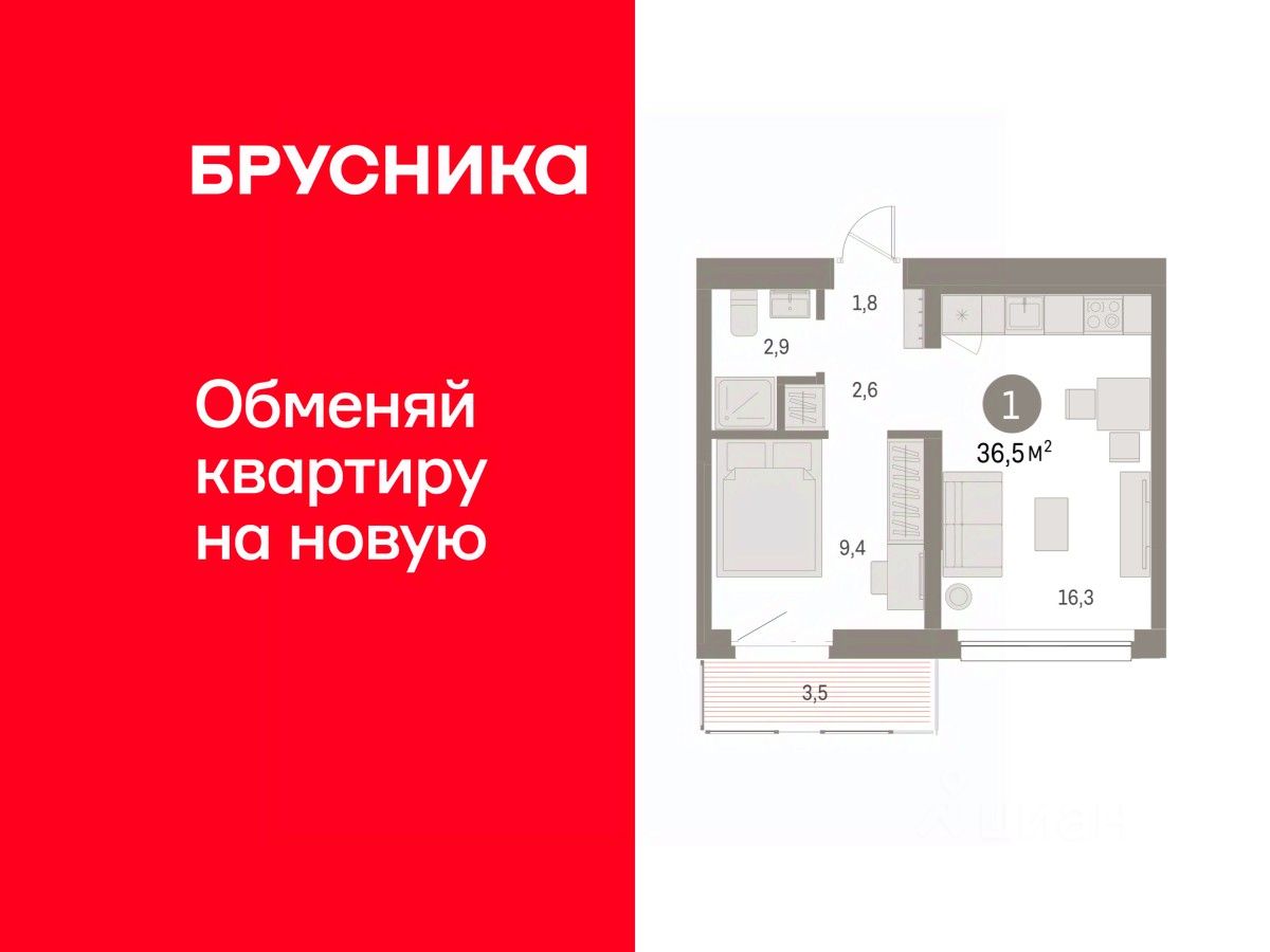 Квартира с кухней-гостиной и одной спальней в квартале "Нефть". Особенности планировки: балкон, вид во двор, предчистовая отделка.