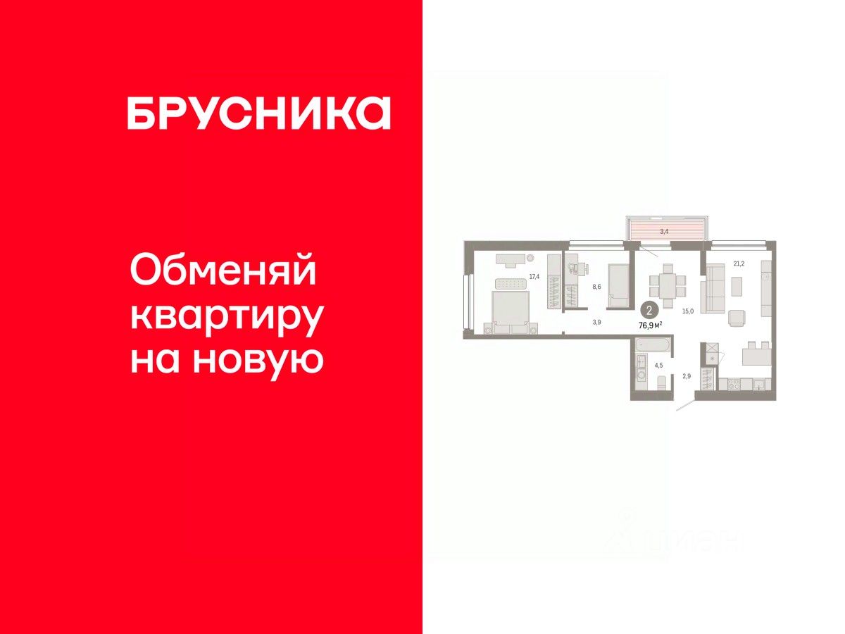 Квартира с кухней-гостиной и двумя спальнями в квартале "Нефть". Особенности планировки: балкон, предчистовая отделка, разнесённые спальни.