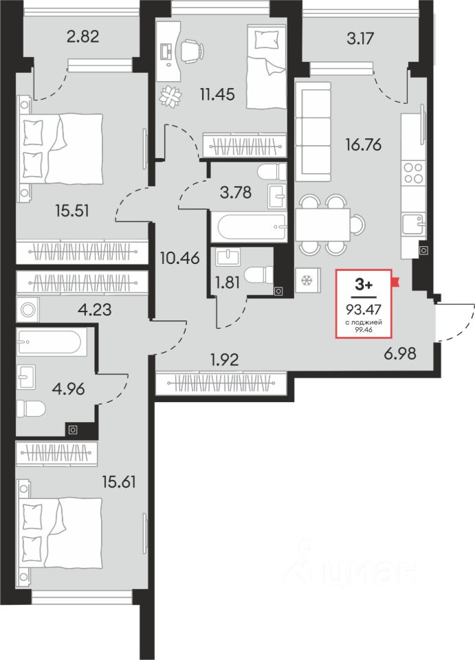 Общая площадь93,47 м²