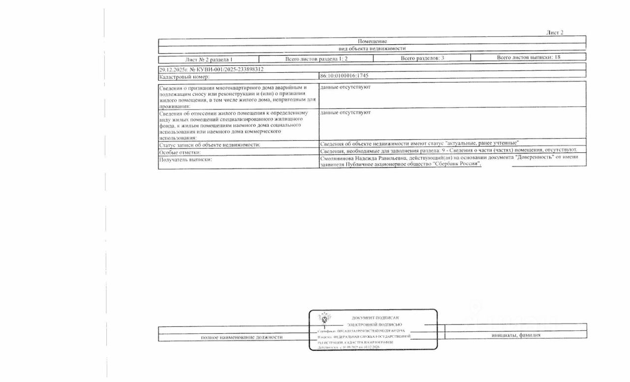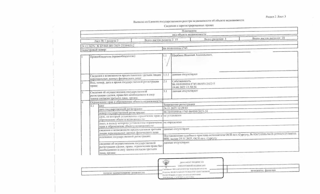 Должник: Щербина Н.А., собственник: Щербина Н.А. Лот: Жилое помещение (квартира), площадь 27,7 кв.м., кадастровый номер: 86:10:0101016:1745, г. Сургут, ул. Майская, д.14, кв.203 (зарегистрировано 2 взрослых, задолженность за кап. ремонт на 03.12.2025 19 т.р.), н/ц: 2798400 р., з-к: 2798 р., код: 0014, рег. 26-30;