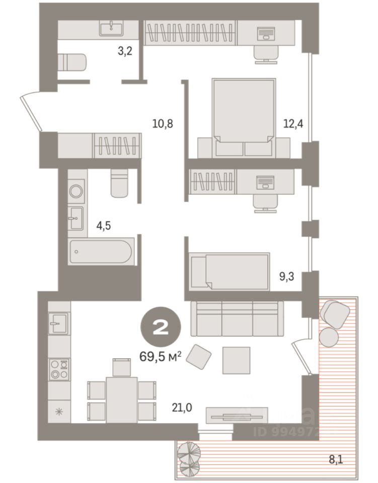 Продается двухкомнатная квартира с предчистовой отделкой в ЖК "Новин" на 11 этаже. Общая площадь: 69.49 кв.м., жилая: 21.7 кв.м., площадь просторной кухни-гостиной: 21 кв.м. Квартира угловая, окна oбecпeчивaют paвнoмepнoe ocвeщeниe в тeчeниe дня. В квартире один балкон, один совмещенный и один раздельный санузел. Наличие в квартире террасы дает возможность для обустройства дополнительной площади. Высота потолков 2.7 м.