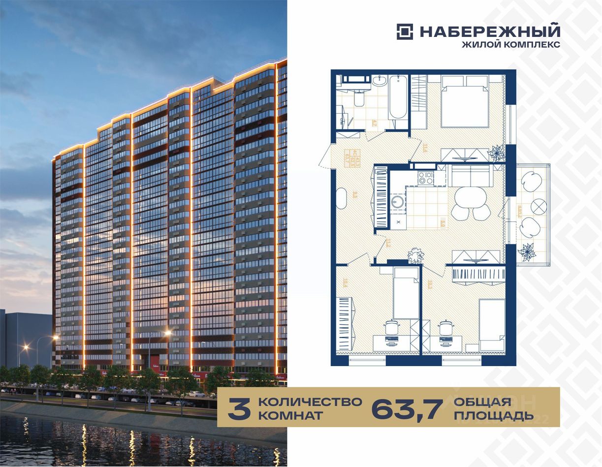 ДОМ ГОТОВ. КЛЮЧИ В ДЕНЬ СДЕЛКИ! Продается уютная трехкомнатная видовая квартира 66 площадью 63,7 кв.м. с большой лоджией и кухней-гостиной площадью 16,2 кв.м., тремя комнатами площадью 11,4 м2, 10,4 м2 и 10,3 м2, в жилом комплексе "Набережный". Общая площадь квартиры — 63,7 кв.м., жилая — 43,3 кв.м. Это идеальное место для комфортной жизни вашей семьи!