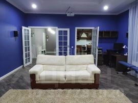 В гостевой зоне просторная кухня, многофункциональный зал с кинотеатром и ещё один с/у.