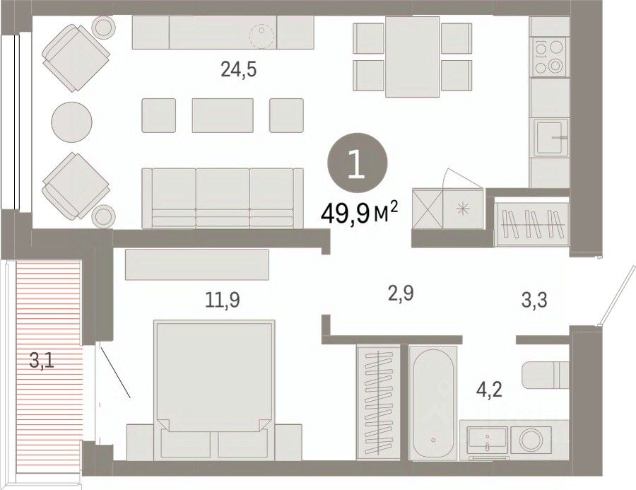 1-комн. квартира от застройщика с предчистовой отделкой в ЖК "Нефть" на 3 этаже. Общая площадь: 49.9 кв.м., жилая: 11.9 кв.м., площадь просторной кухни-гостиной: 24.5 кв.м. Все окна выходят на одну сторону. В квартире одна лоджия, один совмещенный санузел. Высота потолков 2.7 м.