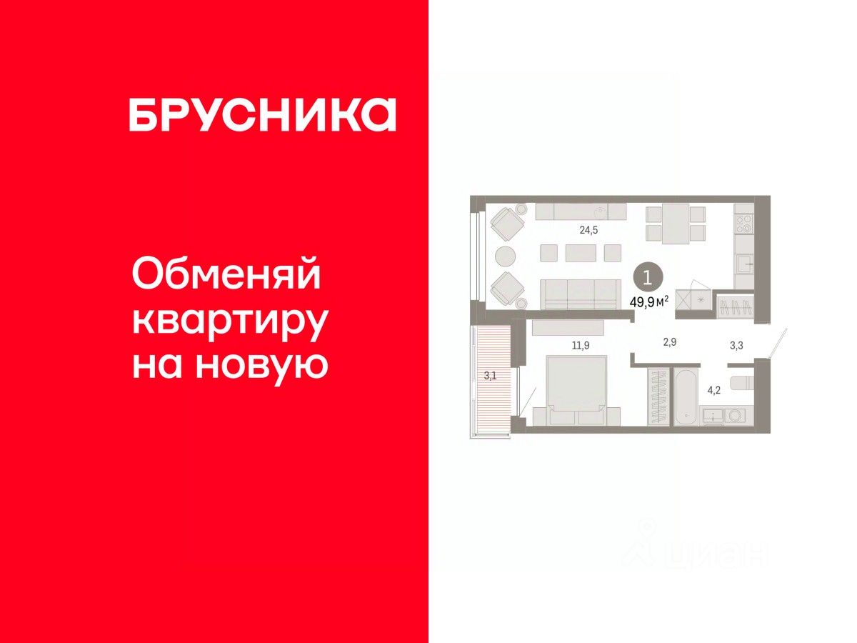 Квартира с кухней-гостиной и одной спальней в квартале "Нефть". Особенности планировки: балкон, предчистовая отделка.