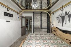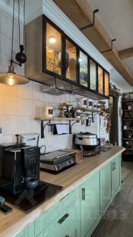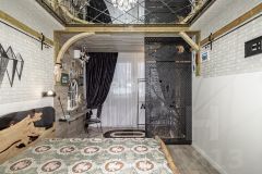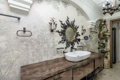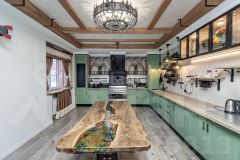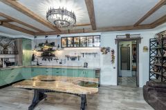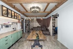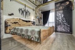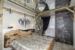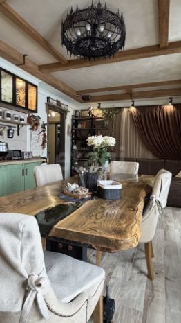 Ремонт: дизайнерский, с авторскими элементами. Все детали из металла — ручная работа собственника. Стол и кровать в спальне выполнены из натурального дерева с эпоксидной смолой — эксклюзивные предметы интерьера.