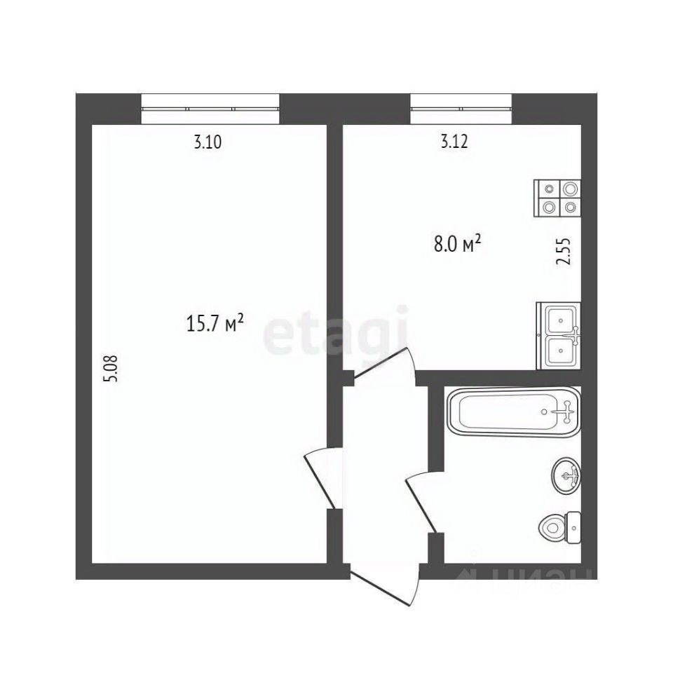 Квартира с изолированной кухней и совмещенным санузлом с установленной ванной. В кухне оборудована функциональная электрическая плита и вытяжка, обеспечено централизованное горячее и холодное водоснабжение. Для повседневного удобства в подъезде работает пассажирский лифт.