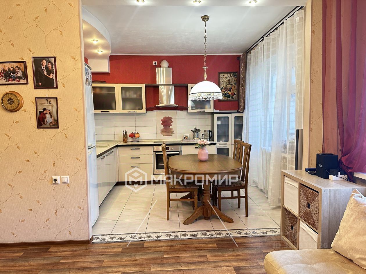 Кухня объединена с гостиной получилось просторное светлое пространство более 20 м². Это сердце квартиры, где удобно собираться всей семьёй за большим обеденным столом.