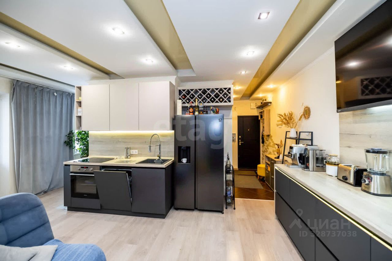 Встроенная кухня в гостинной продумана до мелочей с качественной фурнитурой Blum, вся встроенная техника (варочная панель, духовой шкаф, посудомоечная машина, микроволновая печь) остаются в подарок новым владельцам!