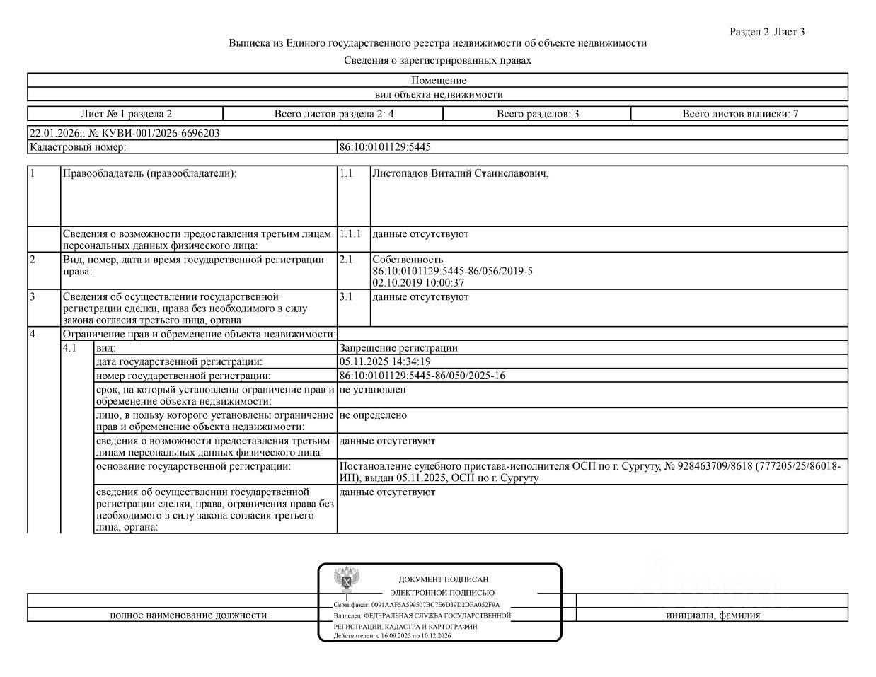 Должник: Листопадов В.С., собственник: Листопадов В.С. Лот: Жилое помещение (квартира), площадь 27,5 кв.м., кадастровый номер: 86:10:0101129:5445 г. Сургут, ул. Александра Усольцева, д. 12, кв. 308 (зарегистрировано 3 взрослых, информация о задолженности за кап. ремонт отсутствует), н/ц: 2332096,04 р., з-к: 2332 р., код: 0014, рег. 26-42;