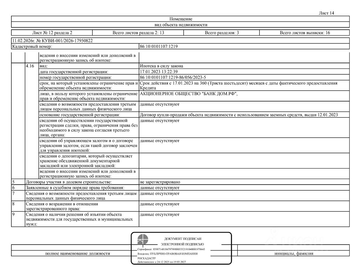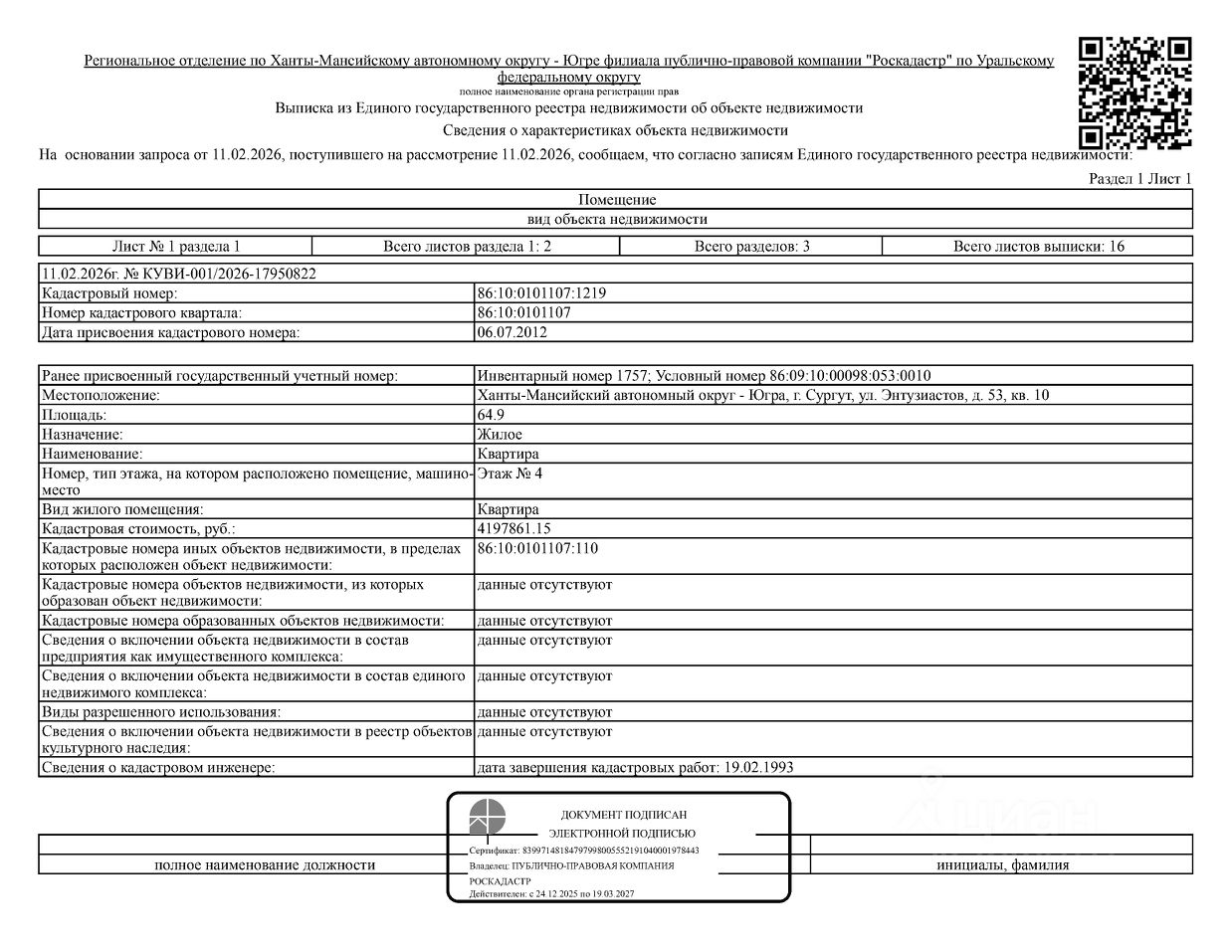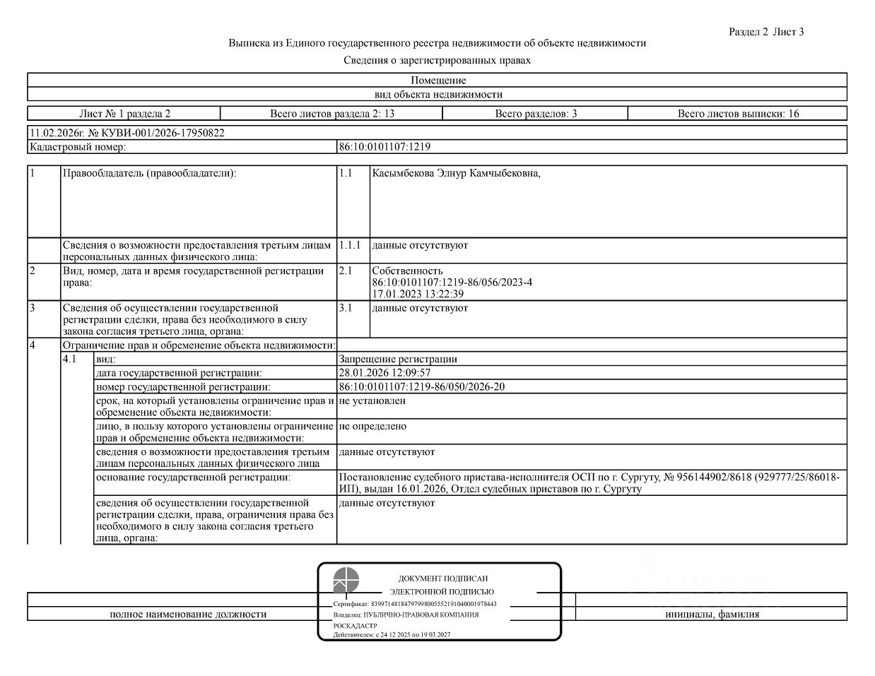 Должник: Касымбекова Э.К., собственник: Касымбекова Э.К. Лот: Жилое помещение (квартира), площадь 64,9 кв.м., кадастровый номер: 86:10:0101107:1219, г. Сургут, ул. Энтузиастов, д. 53, кв. 10 (информация о зарегистрированных лицах отсутствует, задолженность за кап. ремонт на 14.11.2025 17 т.р.), н/ц: 4965752,36 р., з-к: 4965 р., код: 0014, рег. 26-43;
