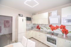 В квартире лет 5 назад сделан ремонт. На полу - кварцвинил, на потолках - натяжные потолки, на стенах - декоративня штукатурка (гладкий шёлк). Заказан кухонный гарнитур и шкафы. Установлены новые межкомнатные двери.