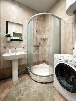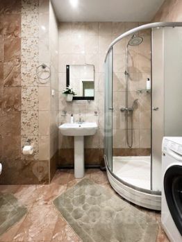 Санузел совмещенный, установлена душевая кабина. На стенах и на полу - кафель. Также установлен бойлер для нагрева воды.