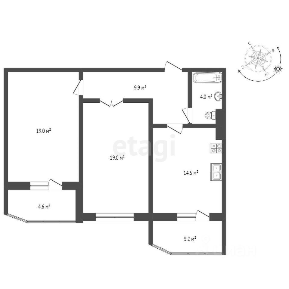 Продаётся светлая двухкомнатная квартира общей площадью 76,2 кв.м, 66.4 без балконов. В квартире выполнен современный ремонт: на полу прочный ламинат, на стенах светлые обои, натяжные потолки. Санузел совмещённый, выполнен в современном стиле с качественной плиткой и сантехникой. Кухня оборудована современной встроенной техникой и новой мебелью, балкон на кухне утеплен и присоединен, что дает дополнительное пространство. Все комнаты изолированные, площадь комнат по 19 кв.м., окна выходят на солнечную сторону. Дополнительными преимуществами является второй балкон в спальне, который можно переоборудовать под кабинет.